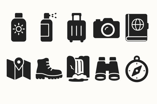 Travel and tourism solid icon set for vacation and trip planning essentials