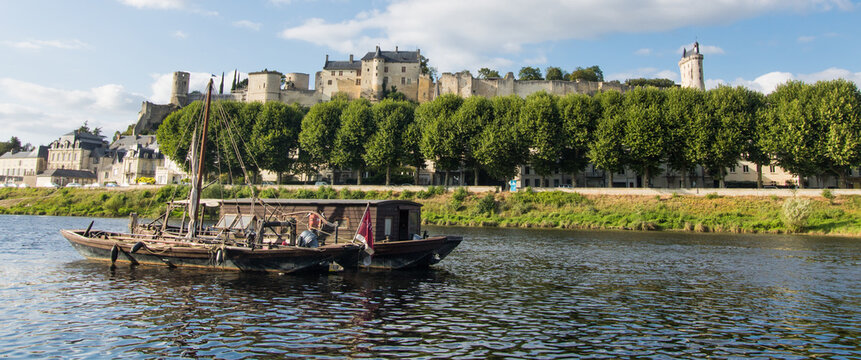 bateau ancien sur la Vienne face à la ville de Chinon en France