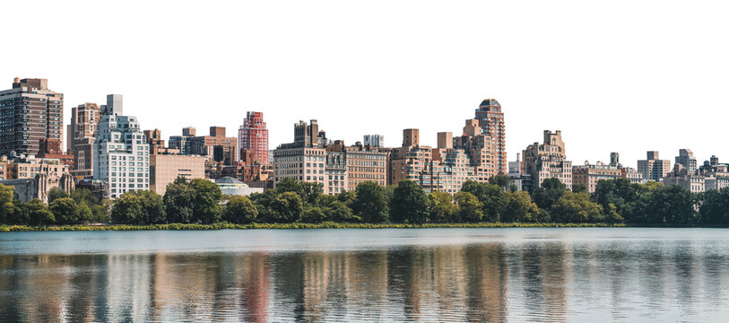 Manhattan skyline with various buildings and a waterfront. The background is isolated and white, enhancing the cityscape's details. Concept of urban city life and architecture