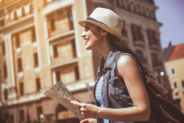 Side view outgoing female exploring city while looking at map. Happy tourist during trip concept