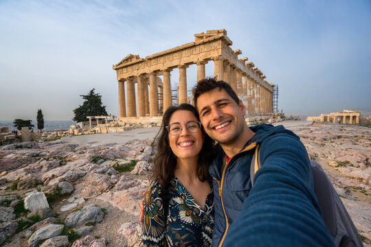 Selfie photo of a tourist couple in Parthenon ancient historic city