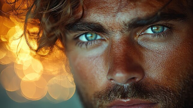 A young man with tousled hair and piercing blue eyes gazes confidently, adorned in a cozy brown jacket and grey sweater, exuding rugged charm and intensity.