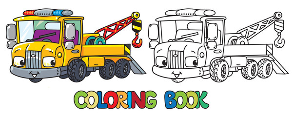 A broken car on an urban street waits for an orange tow truck to rescue it. The tow truck has a flatbed and a winch at the front.