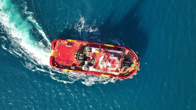 Aerial drone video of assistive tug boat cruising near Mediterranean logistics port