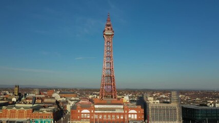 4K: Aerial Drone Video of The Blackpool Tower, England, UK. Flying upwards with the landmark in front. Stock Video Clip Footage