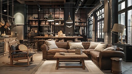 The rustic appeal of the wooden furniture stands out against the backdrop of bustling streets and towering buildings