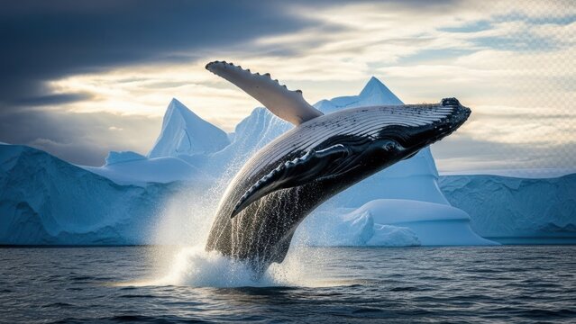 A magnificent humpback whale breaches powerfully from the cold ocean waters against a backdrop of towering icebergs