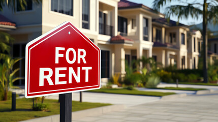 Red "For rent" sign in front of modern townhouse with an attractive exterior located in a quiet location. Real Estate concept