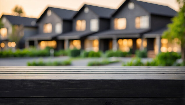 The empty black wooden table top with blur background of modern housing exterior. For product display