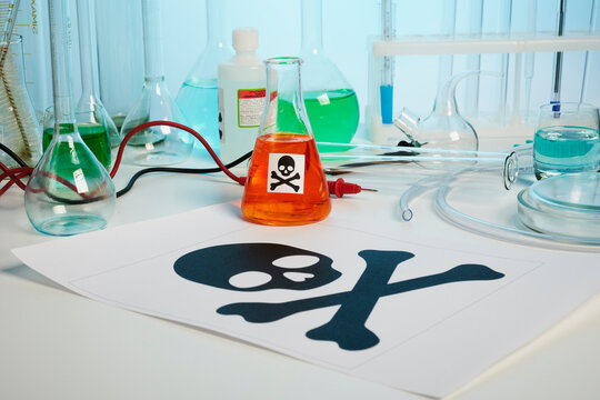 Death printed symbol on a chemical table. Poison fluids in toxicology laboratory. Photo contains danger paper sheet, test tubes, orange colored liquid in chemical flask, some retorts, electrodes