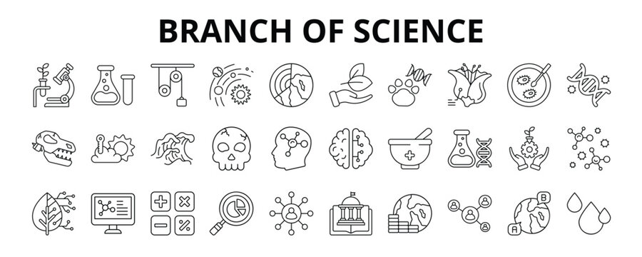 30 Branch of Science Line Icons Vector - Chemistry, Ecology, Botany, Meteorology, Anthropology, Biotechnology, Statistics, Sociology, Economics