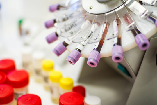 Hand doctor holding urine and blood tube test for analysis for doping or drugs. Doctor's hand with urinalysis and blood sample for drug test or alcohol in the laboratory
