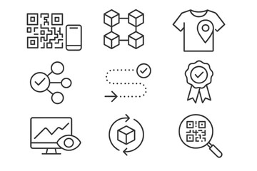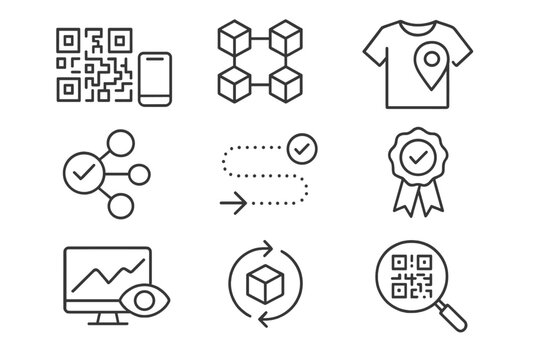 Traceability Icon Set. Line style icons of traceability and transparency: QR code tracking, blockchain for materials, product