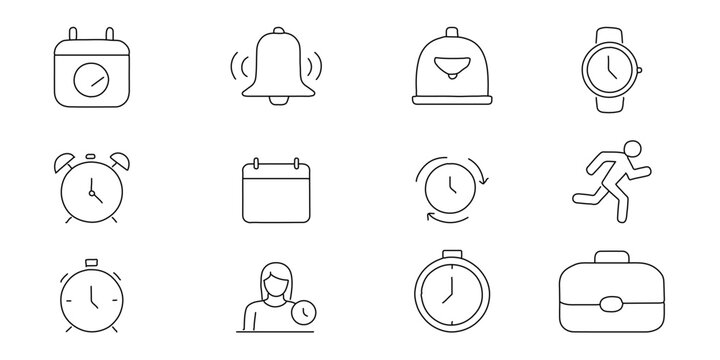 A comprehensive vector line icon set for time management, scheduling, and location tracking, featuring clocks, calendars, and map symbols