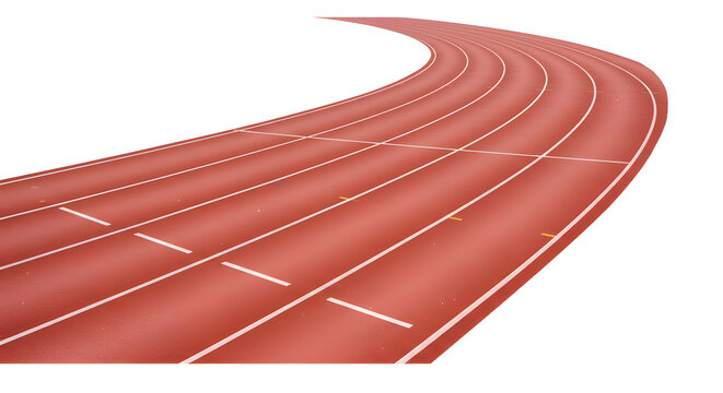 A curved red running track with clear lane markings, set against a bright sky, ideal for athletic training and competitions