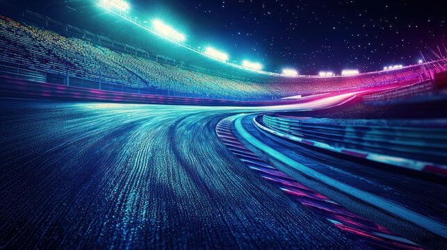 Night race track, vibrant lights, motion blur.