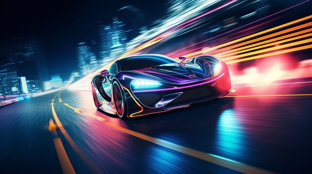 A futuristic sports car speeds along a neon-lit highway, with vibrant lights and trails illuminating the night track. Rendered in 3D.