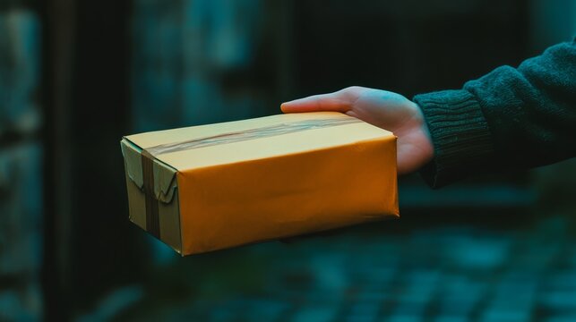 A person holding a brown cardboard package in an outstretched hand, representing delivery service or receiving a parcel.