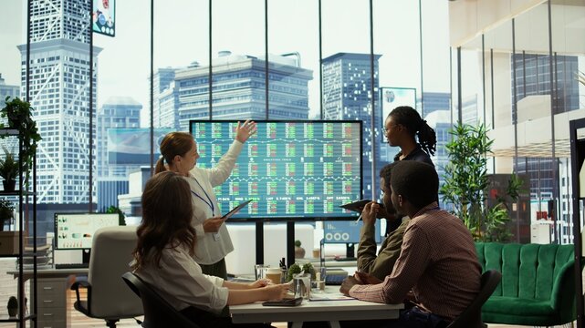 Management team holding a strategy session with the staff, focusing on digital marketing trends, budget allocation and progress tracking to achieve goals and boost market presence. Camera A.