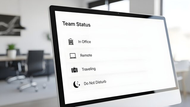 Close-up of a computer monitor displaying a "Team Status" application showing options like "In Office," "Remote," "Traveling," and "Do Not Disturb." This visualizes tracking employee availability for