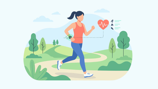 Woman jogging park smart watch. Fitness health tracking pulse. Female runner wearable device heart rate monitor. Active sport lifestyle cardio workout technology concept. Outdoor.