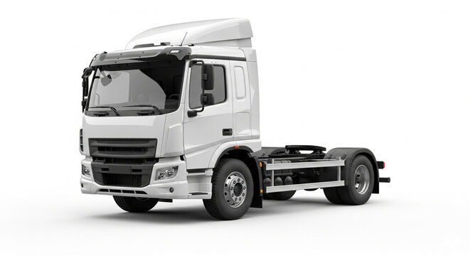 A robust white semi-trailer truck tractor unit parked on an isolated transparent background, head-on view, symbolizing strength in logistics.