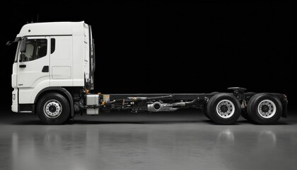 White truck cab focused on robust suspension system. Engineering details for ride comfort, driver safety. Heavy duty truck chassis, automotive parts, mechanical details for road transport.