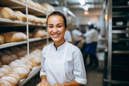 A young female technologist baker smiles against the background of shelves with bread. Professional bakery worker, large bakery, bakery products production