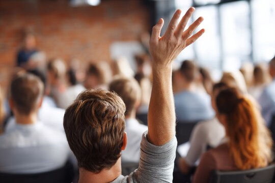 Engaged Audience Hand Raised During Presentation at a Seminar, Seeking Clarification or Participation in Discussion