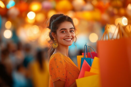 A festive group of friends celebrating Diwali in vibrant traditional Indian attire surrounded by sparkling lights