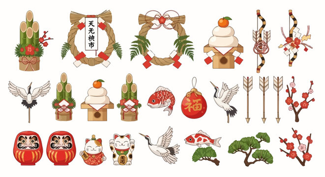 A set of vector illustrations for Japanese New Year, including traditional ornaments and decorations, white background