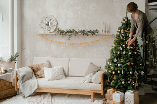 Festive season young woman decorating christmas tree