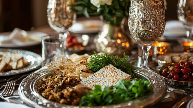Close-up of a Passover seder plate featuring traditional symbolic foods like matzah, charoset, and bitter herbs elegantly arranged for a festive celebration.