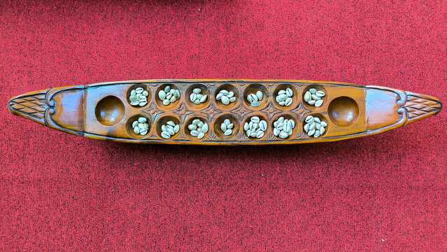 A vintage board game in progress, featuring colorful wooden playing pieces on a well-worn game board.