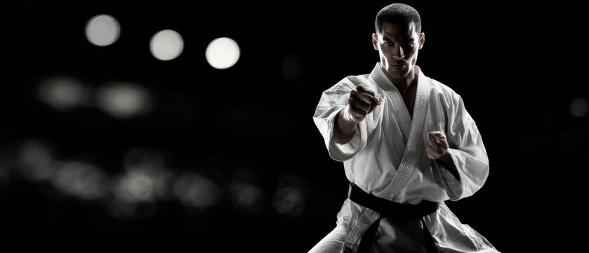 The martial artist delivering a powerful front punch in dramatic studio lighting