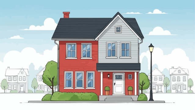 Charming Two Story Red Brick House with White Trim and Lamp Post.