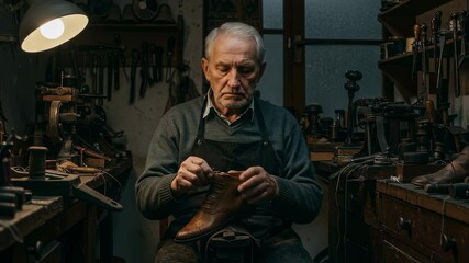 Senior shoemaker crafting leather shoe in workshop for handmade shoes, traditional craftsmanship and artisan work concept with tools and vintage atmosphere