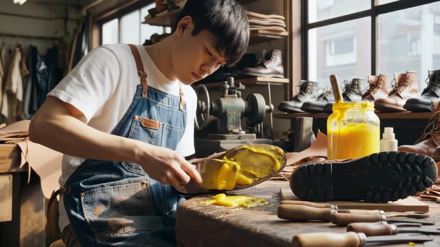 shoemaker crafting leather shoes with precision in professional studio using traditional tools and techniques showcasing skilled hands and detailed craftsmanship in a close-up shot