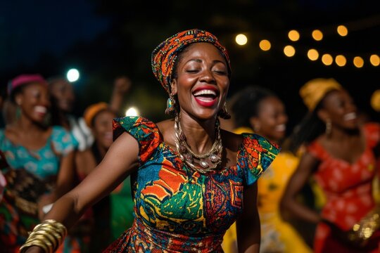 Portrait of a confident woman in vibrant traditional African dress, standing proudly among a group of people.