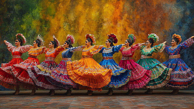 Cinco de Mayo parade dance. A young girl in traditional Mexican attire smiles joyfully, wearing a colorful sombrero and embroidered costume, with friends in the background.