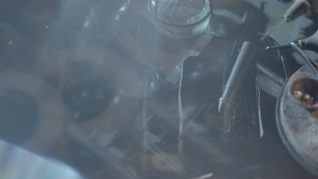 Close up of a men goldsmith working and shaping an unfinished ring with a tool at workbench in workshop.