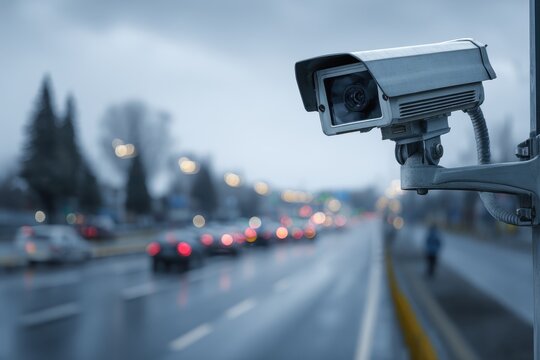 Road traffic control with IP CCTV surveillance monitoring vehicle movement during rainy weather on a busy urban street