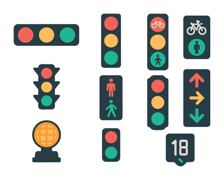 Traffic Light Icon Set. Flat icon set of traffic light variations and designs: horizontal light bar, vertical