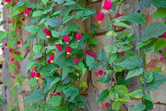 Red flower trailing also know as Abutilon megapotamicum blooming in sunny garden with stone wall background