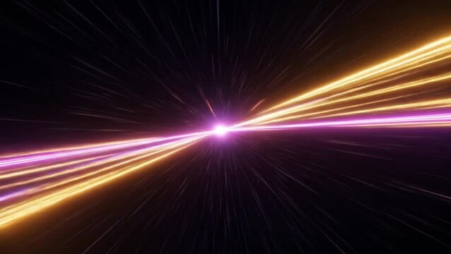 Intersecting golden and purple energy beams crossing at center with glowing motion trails radiating outward on dark space background. Technology concept