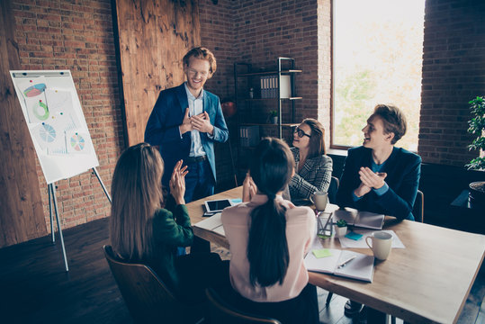 Happy positive smiling female coach, therapist or business team manager supporting and motivating young women in group therapy session or corporate staff training meeting at work