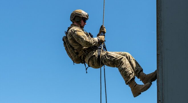Man rappelling down side of building during training exercise. Expert climber descending on rope. Military and defense concept during daytime action.