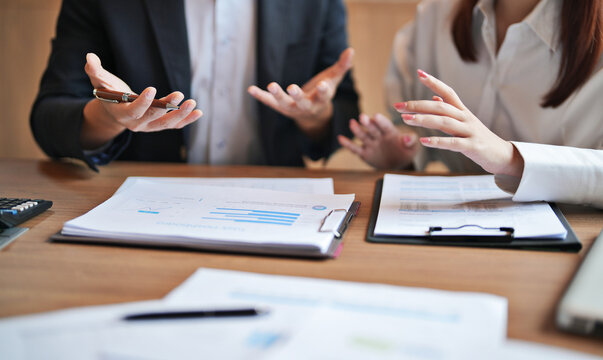 Two happy diverse multiethnic business team people working, talking in corporate office