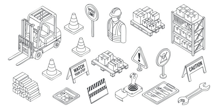 A collection of construction and warehouse icons including forklifts, safety signs, and worker gear in black and white outline vector style, suitable for logistics and safety training materials
