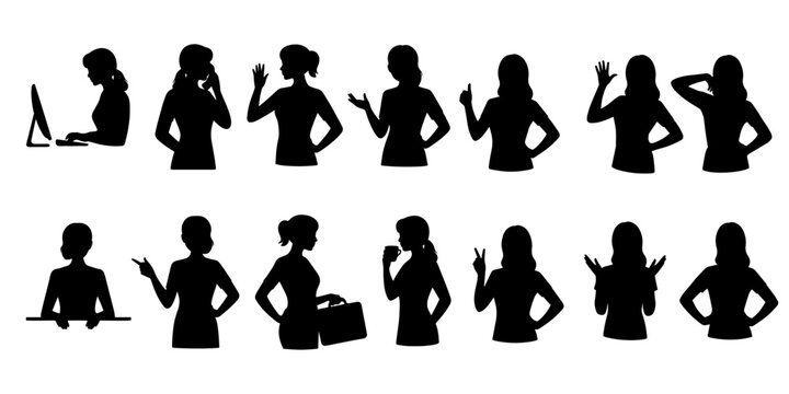 Silhouettes of a woman in varied gestures and activities—working, presenting, pointing, waving—ideal for corporate posters, training materials